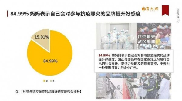 《報告》還顯示,84.99%的媽媽表示自己會對參與抗疫賑災(zāi)的品牌提升好感度。無論是緊急轉(zhuǎn)產(chǎn)口罩,還是疫情發(fā)生后第一時間組織捐款捐物,紙尿褲行業(yè)很多企業(yè)都在疫情期間展現(xiàn)出擔(dān)當(dāng)和責(zé)任。除了口罩、洗手液、消毒液等基礎(chǔ)防疫物資,很多紙尿褲企業(yè)向武漢等疫情重災(zāi)區(qū)捐出大量成人紙尿褲,解決了一線醫(yī)護(hù)人員的生理問題。