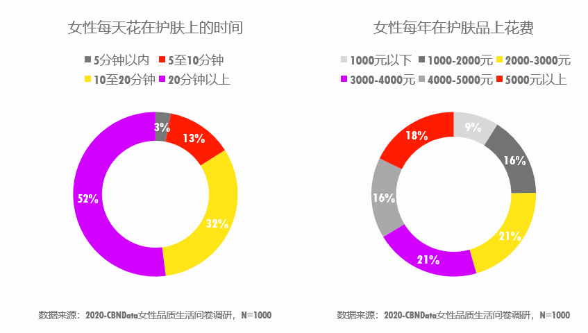 CBNData《報告》指出,近兩年內(nèi),護(hù)膚、口服美容等與顏值相關(guān)的品類帶動萬億級的消費增長,其中洗臉儀、按摩儀、蒸臉儀等高科技美容儀備受青睞。55%的女性每年護(hù)膚品花費超過3000元,超過半數(shù)的女性每天花在護(hù)膚上的時間超過20分鐘。