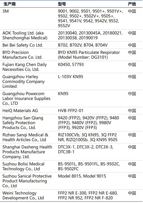 附:FDA 授權(quán)進(jìn)口的非 NIOSH 批準(zhǔn)的中國(guó)口罩商名單(5月7日更新)