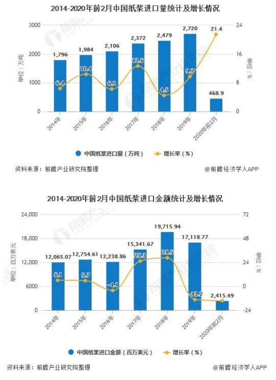 據(jù)中國海關(guān)總署統(tǒng)計(jì)數(shù)據(jù)顯示,2019年去年中國紙漿進(jìn)口量達(dá)到了2720萬噸,累計(jì)增長9.7%。截止至2020年1-2月中國紙漿進(jìn)口量達(dá)到468.9萬噸,相比上年同期增長了83萬噸,累計(jì)增長21.4%。