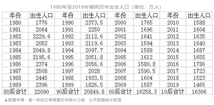 新生人口是母嬰行業(yè)基本盤(pán)中的基本盤(pán)。進(jìn)入21世紀(jì)以來(lái),這二十年間總共有多少人出生?隨著出生率逐年下降,00后和10后,相比80后和90后,究竟少了多少人?近日,第一財(cái)經(jīng)根據(jù)歷年統(tǒng)計(jì)公報(bào)、公開(kāi)數(shù)據(jù)統(tǒng)計(jì)梳理發(fā)現(xiàn),我國(guó)80后、90后、00后、10后人數(shù)分別為2.21億、2.08億、1.63億(16258萬(wàn))、1.63億(16306萬(wàn))。