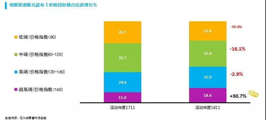2018年紙尿褲市場(chǎng)最明顯的變化是,多年來(lái)固化的內(nèi)外資品牌格局正在被打破,從花王、好奇、幫寶適、尤妮佳、大王為代表的外資大牌紙尿褲發(fā)展態(tài)勢(shì)來(lái)看,花王和好奇紙尿褲在大幅下滑,尤妮佳開(kāi)始超越花王,幫寶適借一級(jí)幫觸底反彈,大王紙尿褲正處上升盛世,不過(guò)增長(zhǎng)壓力、控價(jià)壓力越來(lái)越大。與此同時(shí),高端紙尿褲市場(chǎng)出現(xiàn)突破機(jī)會(huì)。從尼爾森零售市場(chǎng)數(shù)據(jù)來(lái)看,2018年160元以上超高端價(jià)位的紙尿褲銷(xiāo)售額增長(zhǎng)超30%,對(duì)比鮮明的是,中低端紙尿褲市場(chǎng)下滑嚴(yán)重。目前紙尿褲市場(chǎng)中,進(jìn)口有機(jī)材質(zhì)、日夜用等細(xì)分概念,以及適合寶寶運(yùn)動(dòng)的拉拉褲在引領(lǐng)行業(yè)增長(zhǎng),尤其是三四線城市增長(zhǎng)迅速。