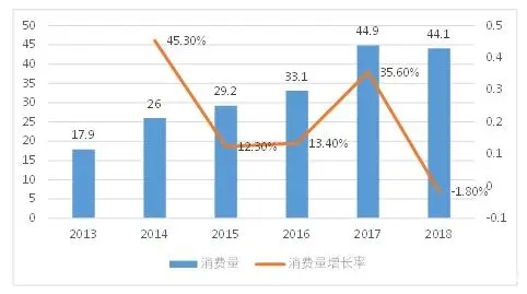 從消費(fèi)量來看,2013年以來,我國(guó)成人失禁用品的消費(fèi)量增長(zhǎng)較為迅速,從2013年的 17.9億片增加至2018年的44.1億片,年均復(fù)合增長(zhǎng)率達(dá)到19.8%。