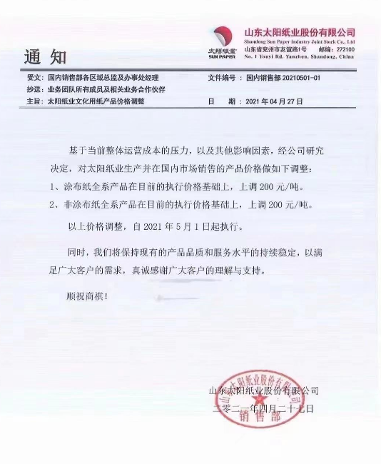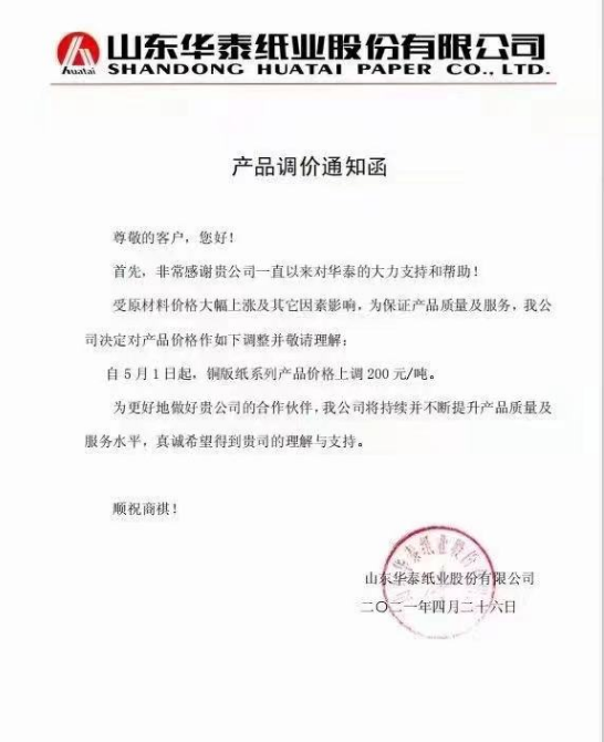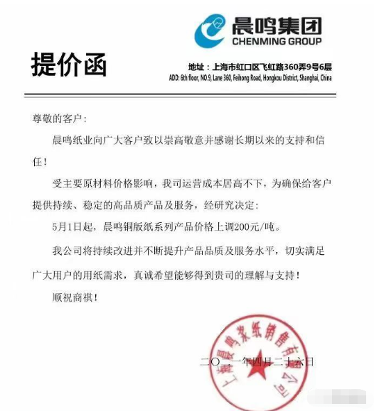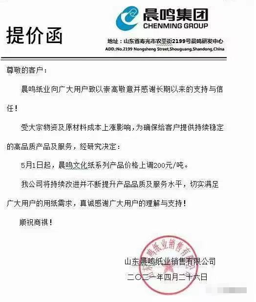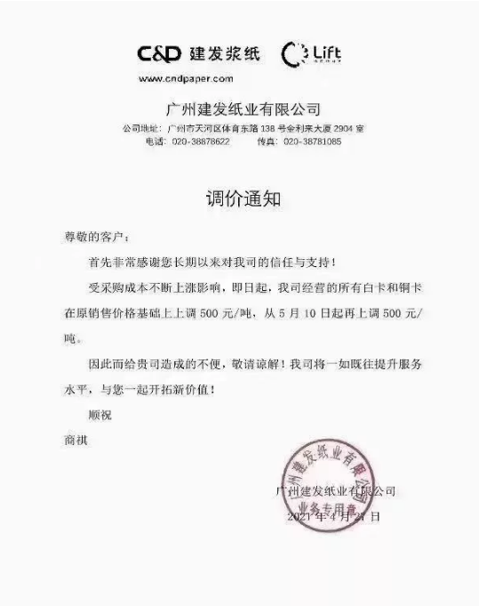 廈門國貿(mào)紙張華南區(qū):即日起,對我司經(jīng)營的全線白卡紙、銅版紙產(chǎn)品在原售價基礎(chǔ)上統(tǒng)一上調(diào)500元/噸。自5月10日起,再上調(diào)500元/噸。
