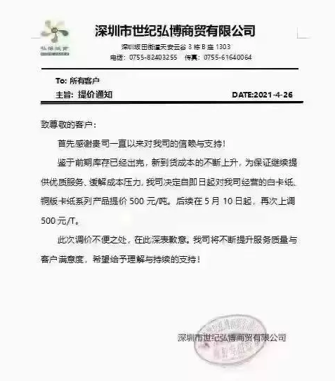 世紀弘博:即日起對我司經(jīng)營的白卡紙、銅版卡紙系列產(chǎn)品提價500元/噸。后續(xù)在5月10日起,再次上調(diào)500元/噸。