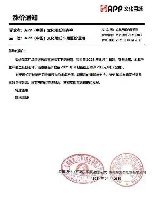 APP文化用紙:5月1日起,針對金東、金海所生產(chǎn)的各系各紙種、克重紙品價格在2021年4月基礎(chǔ)上調(diào)漲200元/噸(含稅)。