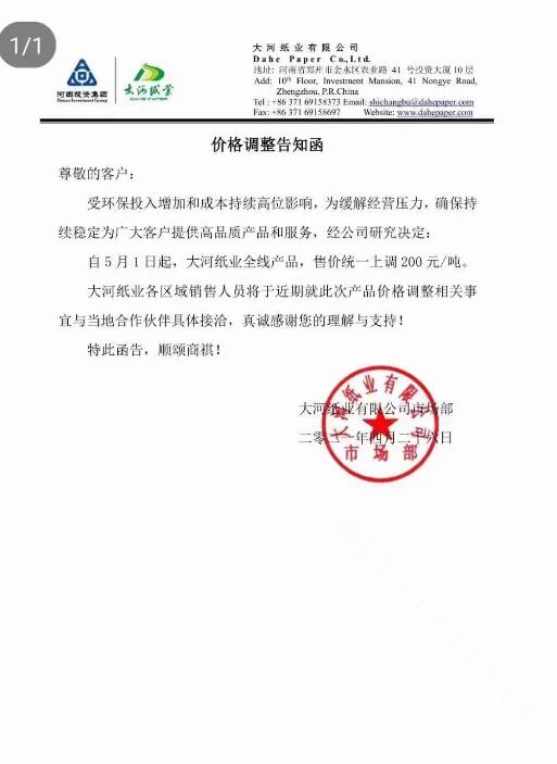 大河紙業(yè):5月1日起,大河紙業(yè)全線產(chǎn)品,售價統(tǒng)一上調(diào)200元/噸。