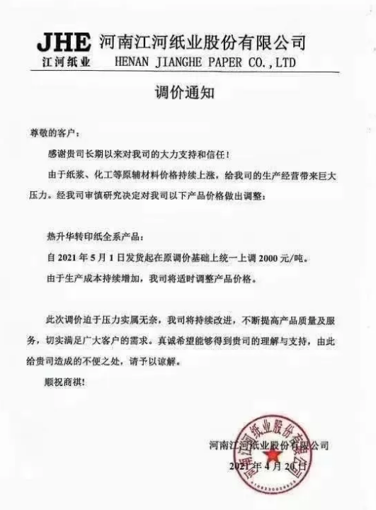 仙鶴新材料:5月1日發(fā)貨起,我司供應(yīng)的噴繪熱轉(zhuǎn)印原紙,在現(xiàn)價基礎(chǔ)上,上調(diào)2000元/噸,后續(xù)亦將視原材料價格上漲幅度繼續(xù)漲價。