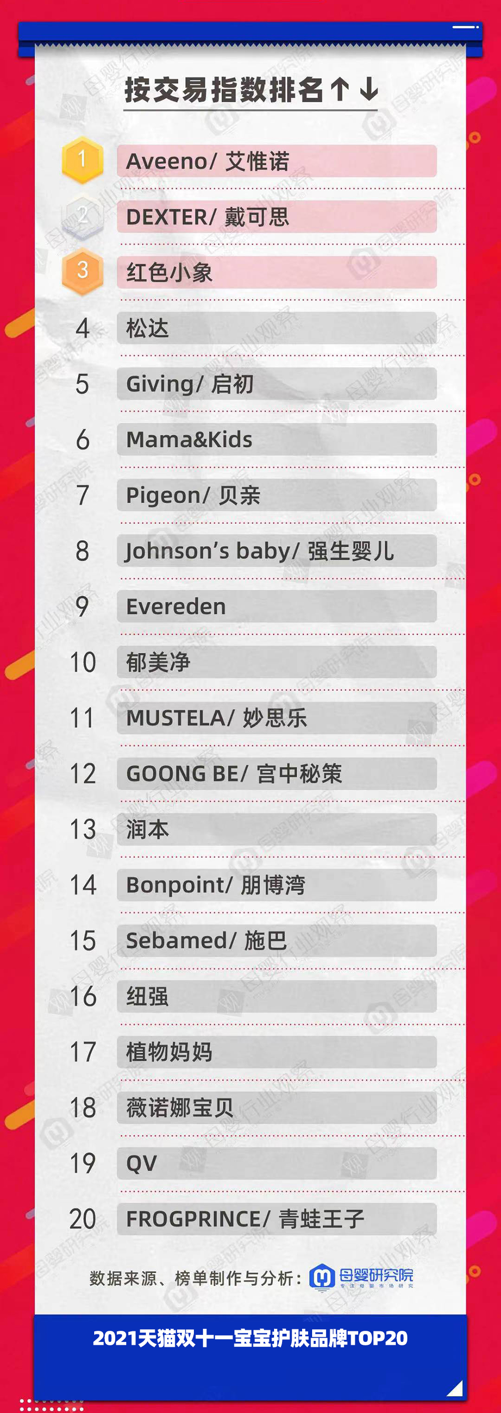 寶寶護(hù)膚品牌的Aveeno艾維諾、DEXTER戴可思以及紅色小象問鼎品類TOP3。上一年度雙11的品類前三分別為Aveeno艾維諾、紅色小象和松達(dá)。