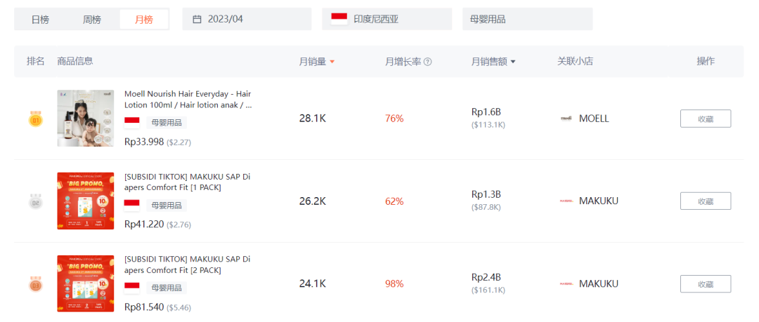 4月- Top1的商品為兒童洗發(fā)水,月銷量為28.1K,月銷售額為113.1K(美金)月增長率為76%,Top2的商品是紙尿褲,月銷量為26.2K,銷售額為87.8K(美金)月增長率為62%,Top3的商品為紙尿褲組合裝,月銷量為24.1K,月銷售額為161.1K(美金)月增長率為76%。