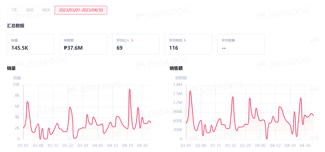 品牌Unilove在3-4月之間銷量為145.5K,銷售額為?37.6M(736.96K美金),其中,在TikTok的帶貨達(dá)人有69位,帶貨視頻有116個。在4-20單日銷量達(dá)到了9.6K,在3-3單日銷售額達(dá)到?1.6M(31.36K美金)。
