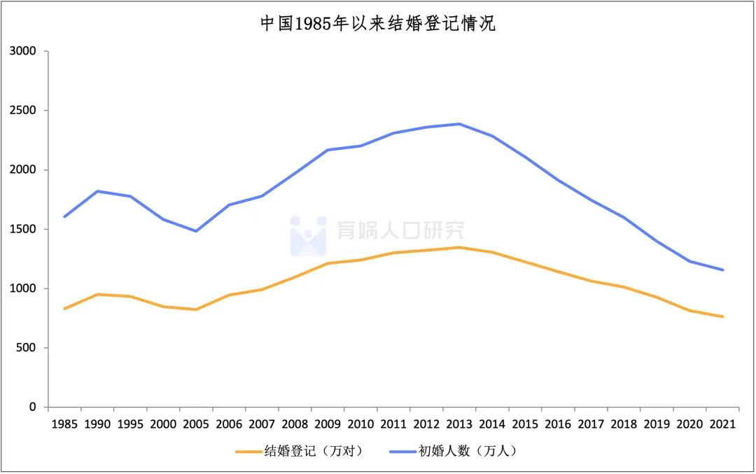 初婚人數在2013年達到2386萬人的峰值后持續(xù)下降,2021年下降到1158萬人,比2013年下降51.5%。2013年結婚登記對數為1347萬對,2022年結婚登記對數下降到683萬對,連續(xù)九年下降。