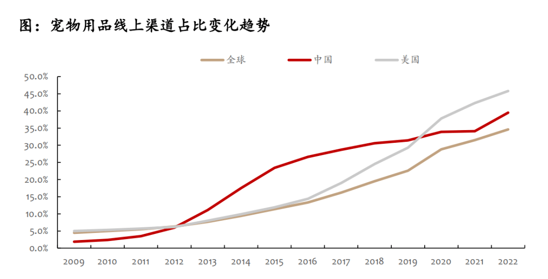 隨著電商平臺(tái)的迅猛發(fā)展以及線上購(gòu)物的便捷性,寵物用品線下銷售渠道占比有所下降,而線上渠道占比持續(xù)提升。根據(jù)歐睿國(guó)際的數(shù)據(jù)顯示,全球?qū)櫸镉闷肪€上渠道占比由2013年的7.7%增長(zhǎng)至2022年的34.6%,13-22年規(guī)模CAGR高達(dá)18.17%。