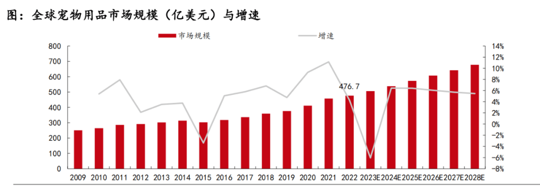 根據(jù)歐睿國(guó)際數(shù)據(jù)顯示,2019-2021年寵物用品市場(chǎng)增速分別為4.76%、9.28%、11.16%。2022年增速有所放緩,僅為4.28%,全球?qū)櫸镉闷芬?guī)模達(dá)477.68億美元,2019-2022年復(fù)合增長(zhǎng)率為8.20%,預(yù)計(jì)2022-2028年寵物用品復(fù)合年均增長(zhǎng)率為3.03%,寵物用品市場(chǎng)規(guī)模將達(dá)到677.25億美元。