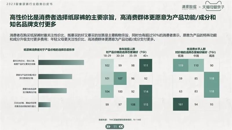 根據(jù)白皮書(shū)數(shù)據(jù)顯示,消費(fèi)者在購(gòu)買(mǎi)紙尿褲時(shí)最關(guān)注性價(jià)比,“又好又劃算”是主要購(gòu)物宗旨,同時(shí)也有超過(guò)50%的消費(fèi)者表示,愿意為產(chǎn)品的特殊功能和成分升級(jí)支付更多費(fèi)用:年輕父母更關(guān)注性價(jià)比,高消費(fèi)群體更愿意為產(chǎn)品功能/成分支付更多。