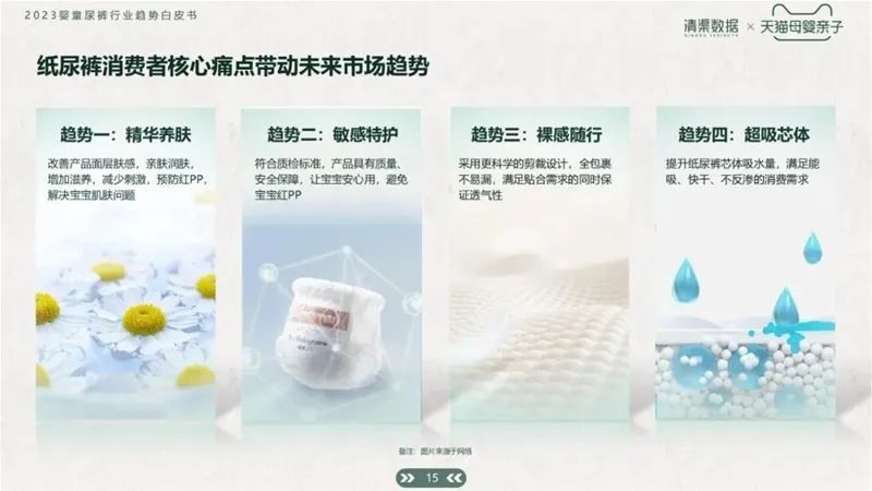 為解決6月齡內(nèi)新生兒的紅屁屁問(wèn)題;1歲齡左右寶寶的側(cè)漏后漏問(wèn)題;以及隨著寶寶年齡增長(zhǎng),對(duì)紙尿褲吸水量需求變大、紙尿褲表層潮濕等問(wèn)題,有超過(guò)50%的消費(fèi)者表示,愿意為產(chǎn)品的特殊功能和成分升級(jí)支付更多費(fèi)用。延伸出了精華養(yǎng)膚、敏感特護(hù)、裸感隨行、超吸芯體四大趨勢(shì)。