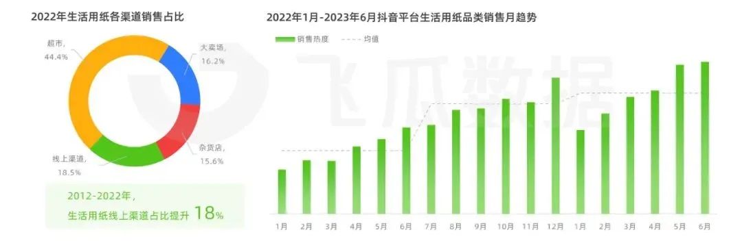 不可否認(rèn),從現(xiàn)階段分渠道來看,線下商超仍是人們購(gòu)買生活用紙的首要渠道,22年銷售占比超過44%。