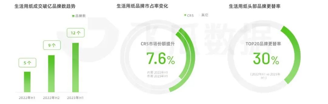 據(jù)飛瓜統(tǒng)計(jì),2023上半年抖音平臺(tái)成交破億的生活用紙品牌數(shù)已超過12個(gè),較22年同期增加7個(gè)。其中,CR5品牌市場(chǎng)份額為34%,較22年同期增長(zhǎng)7.6%,頭部品牌集中度進(jìn)一步提高。