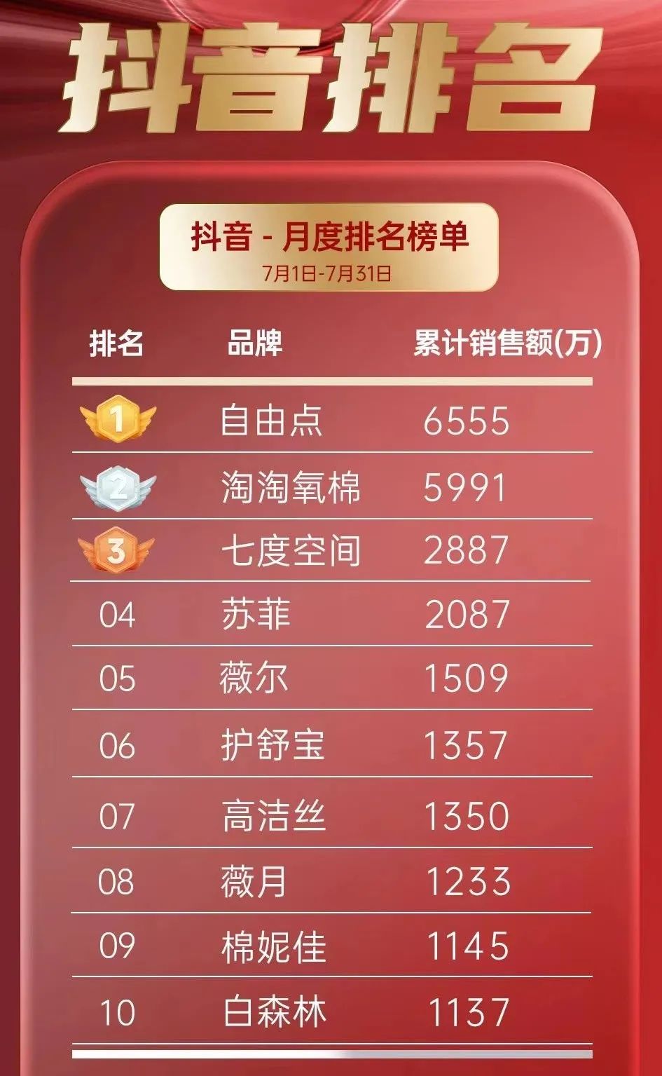根據(jù)第三方數(shù)據(jù)平臺(tái)顯示,抖音平臺(tái)2024年7月份衛(wèi)生巾前十銷售榜單,其中,“自由點(diǎn)”品牌以6555萬元的銷售額高居榜首,展現(xiàn)出了強(qiáng)大的市場(chǎng)號(hào)召力和消費(fèi)者認(rèn)可度。