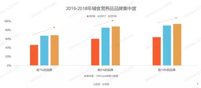 目前輔食營養(yǎng)品大致分為嬰幼兒營養(yǎng)品、寶寶輔食、寶寶零食、嬰幼兒調味品四個子品類。從上圖我們不難看出,從2016年—2018年嬰幼兒營養(yǎng)品從不足50%提升至50%以上,銷售占比逐年提升,發(fā)展態(tài)勢一片大好。一方面,“生命早期1000天營養(yǎng)健康”在政府層面的確立,更是為嬰兒營養(yǎng)品打開了市場的大門;另一方面,在優(yōu)生優(yōu)育觀念的影響下,孕育下一代成為每個家庭的頭等大事,嬰幼兒營養(yǎng)品的市場占比與熱度日益提升。