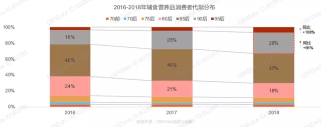 隨著90后新生代媽媽的不斷增多,母嬰人群的認知水平及消費水平大幅提升,她們更愛愿意為“健康”的生活態(tài)度付費。從上圖可以看出,近三年來,85后仍為輔食營養(yǎng)品的主要購買人群,人數(shù)占比為40%左右,在所有人群中最為強勢;而90/95后作為新生代母嬰消費人群異軍突起,消費者人數(shù)大幅增長,人數(shù)占比從2016年18%提升至30%以上,其中,90后成為一股新興力量,2018年較2017年增長66%,有望成為嬰幼兒營養(yǎng)品的下一個主力人群。